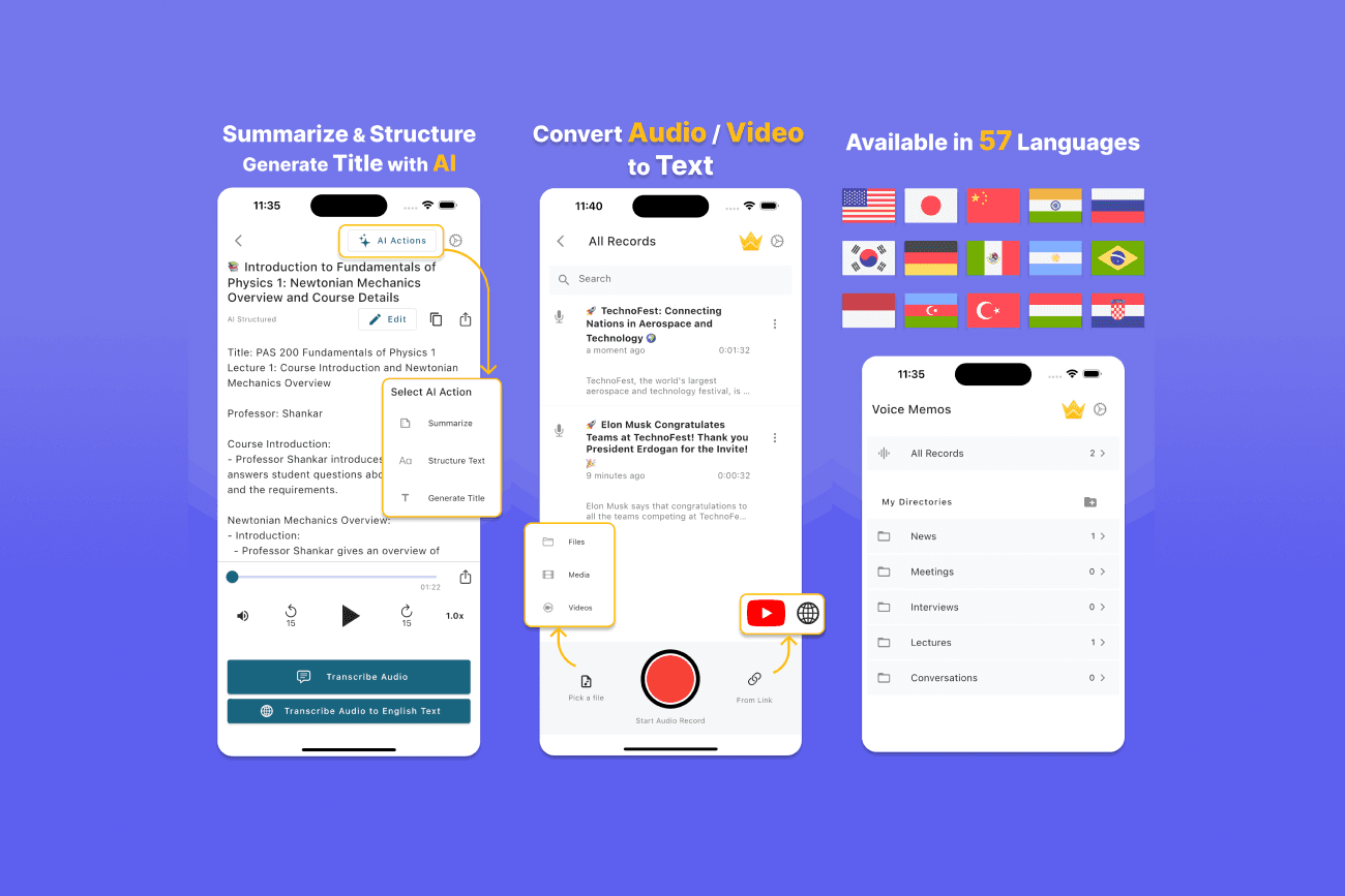 Record or Import Voice and transcribe it to text in seconds. First 2 minutes is free, don't wait use the app now.